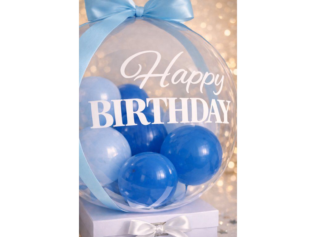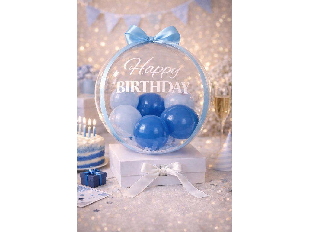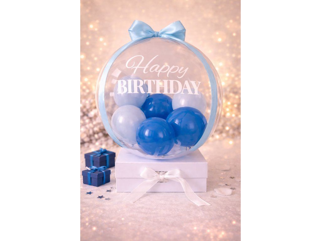 Moderní narozeninový balónkový set Modré narozeniny promění předání dárku ve stylové překvapení. Průhledný balonek s modrými balónky a nápisem Happy Birthday/Krásné narozeniny je usazen na elegantní dárkové krabičce, do které můžete vložit vlastní dárek. Originální balení, které z obyčejného předání vytvoří nezapomenutelný narozeninový moment.