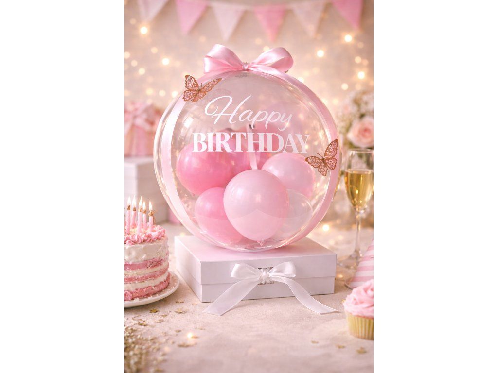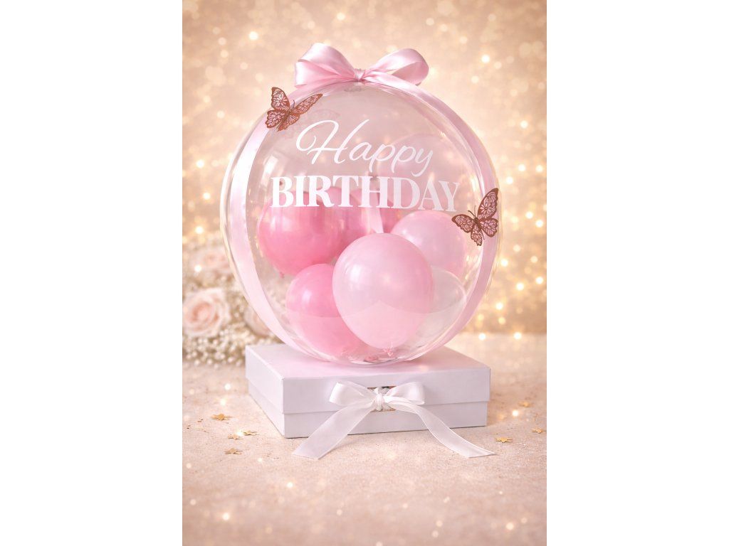 Elegantní narozeninový balónkový set Růžové narozeniny promění předání dárku ve skutečné překvapení. Průhledný balonek s jemnými růžovými balónky a dekorativními motýlky je usazen na dárkové krabičce, do které můžete vložit vlastní dárek. Originální balení, které z obyčejného předání vytvoří nezapomenutelný narozeninový moment.