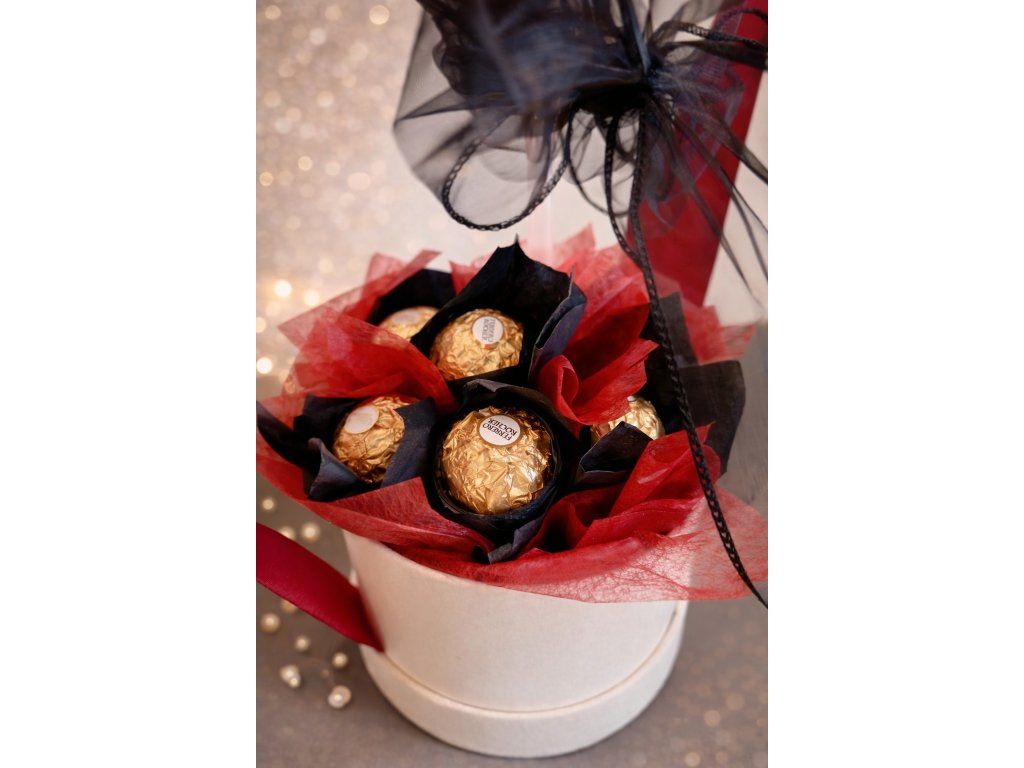 Tento originální dárkový set kombinuje jemnou dekoraci, elegantní design a oblíbené čokoládové pralinky Ferrero Rocher. Výsledkem je stylový a romantický dárek, který je připravený rovnou k předání.